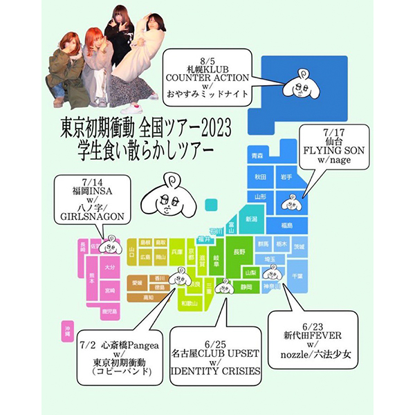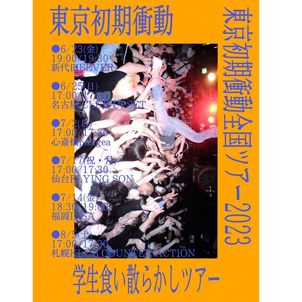 6/23(金) 東京・新代田FEVERよりスタートする 東京初期衝動の夏の全国ツアー『学生食い散らかしツアー』では、各地の学生バンドをオープニングアクトとして一般公募。オリジナル・コピーは問わずという条件のもと、たくさんの応募者の中8組の学生バンドが決定した。コピバンも多数登場することもあり、東京初期衝動も今回のツアーでは、ザ・ブルーハーツの1000のバイオリン再生ボタンmixと氣志團のワンナイトカーニバルをカバーするとSNSで公言。