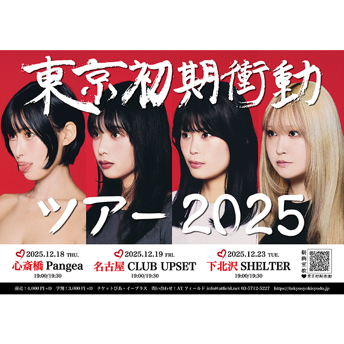 KING RECORDS より9/24 (水)メジャーデビューアルバム「東京初期衝動」をリリースした東京初期衝動。 レコ発となった 10/5(日) 東京キネマ倶楽部 ワンマンに続き、東名阪ツアー「東京初期衝動ツアー2025」開催決定!! 2025年12月18日(木) OPEN 19:00 / START 19:30 Live House Pangea ●前売料金 一般 ¥4,000 学割 ¥3,000(オールスタンディング) ※おひとり様4枚までとさせて頂きます。※小学生以上はチケットが必要になります未就学児は保護者同伴に限り入場無料学割対象 大学生/高校生/中学生/専門学校生 他 入場時に学生証提示(コピー不可) ※整理番号順の入場になります。※ドリンク代金別途要 2025年11月8日(土)10時発売 ●チケットぴあ [WEBのみ受付] Pコード:311-715 ●イープラス ※プレイガイド店頭発売あり ※0570で始まる番号は、一部携帯電話、PHS、CATV接続電話からのご利用はできません。 ATフィールド 03-5712-5227 info@atfield.net