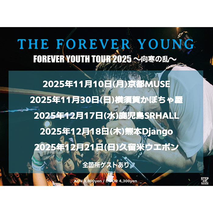 ★オフィシャル先行 10/10(金)18:00-10/16(木)23:59 https://eplus.jp/theforeveryoung-fyt/ 2025年11月10日(月) OPEN 18:30 / START 19:00 KYOTO MUSE ●前売料金 ¥3,800-(全自由) ※おひとり様4枚までとさせて頂きます。※未就学児童のご入場はできません※危険行為・迷惑行為の禁止 ※未就学児童入場不可 ※整理番号順の入場になります。※ドリンク代金別途要 --- ●イープラス ※プレイガイド店頭発売なし ※0570で始まる番号は、一部携帯電話、PHS、CATV接続電話からのご利用はできません。 GREENS 06-6882-1224(平日12:00~18:00) https://www.greens-corp.co.jp/