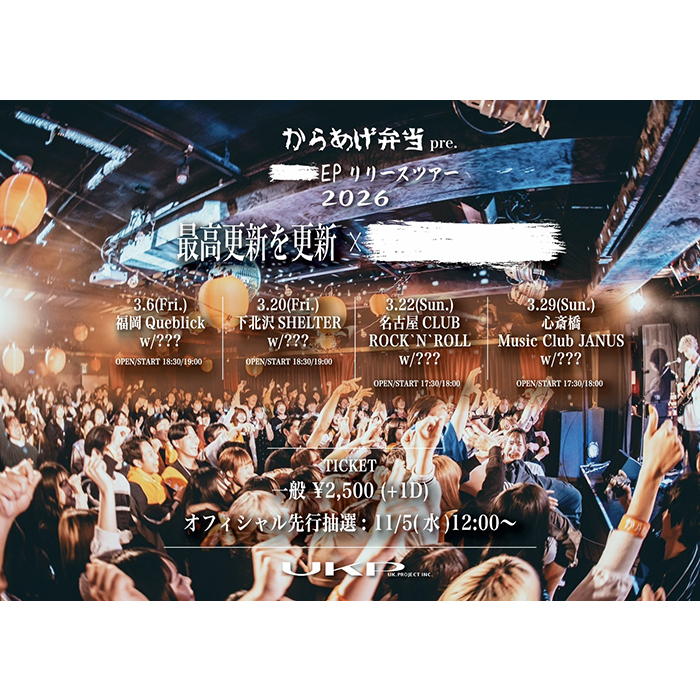 2026年3月29日(日) OPEN 17:30 / START 18:00 Music Club JANUS ●前売料金 ¥2500(オールスタンディング) ※おひとり様4枚までとさせて頂きます。※整理番号順の入場になります。※ドリンク代金別途要 --- ●チケットぴあ [WEBのみ受付] Pコード:313-605 ●イープラス ※プレイガイド店頭発売あり ※0570で始まる番号は、一部携帯電話、PHS、CATV接続電話からのご利用はできません。 GREENS 06-6882-1224(平日12:00~18:00) https://www.greens-corp.co.jp/