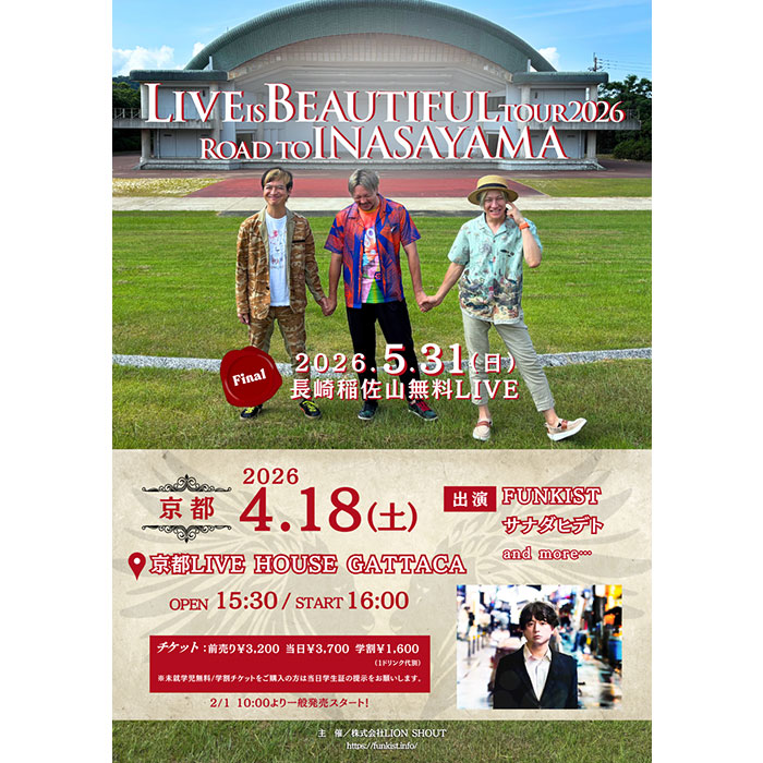 2026年4月18日(土) OPEN 15:30 / START 16:00 LIVE HOUSE GATTACA ●前売料金 ●一般¥3,200- ●学割¥1,600-(オールスタンディング) ※小学生以上はチケットが必要になります未就学児童は保護者同伴にて無料です。 学割チケットの方は当日学生証の提示をお願いします。※整理番号順の入場になります。※ドリンク代金別途要 NOW ON SALE ●チケットぴあ [WEBのみ受付] Pコード:318-895 ●イープラス ※プレイガイド店頭発売あり ※0570で始まる番号は、一部携帯電話、PHS、CATV接続電話からのご利用はできません。 GREENS 06-6882-1224(平日 12:00-18:00) https://www.greens-corp.co.jp/ ・GATTACA 050-1225-6613