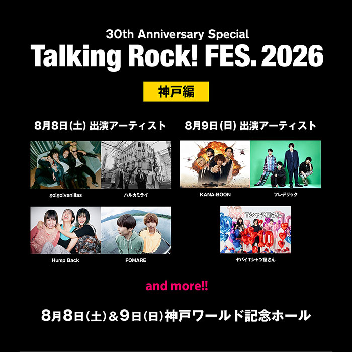 今年は本誌創刊30周年を記念して7月11日(土)&12日(日)にお馴染みの横浜アリーナで、さらに8月8日(土)&9日(日)に神戸ワールド記念ホールで、初めて東西で開催する『Talking Rock! FES.2026』の第1弾出演アーティストの発表です。今回は横浜編が 7月11日(土)にクリープハイプ、04 Limited Sazabys、My Hair is Badが。7月12日(日)に今号=4月9日発売のTalking Rock!26年5月号の表紙アーティストのChevonと、10-FEET、ヤバイTシャツ屋さんが。そして神戸編は8月8日(土)にgo!go!vanillas、ハルカミライ、Hump Back、FOMAREが。8月9日(日)にKANA-BOON、フレデリック、ヤバイTシャツ屋さんの出演が決定しました。第1弾から本誌お馴染みの豪華な顔ぶれが揃いましたが、この先も人気アーティストが続々と登場しますので、どうぞご期待ください。チケットの一般発売は6月13日(土)からですが、その前にオフィシャル2次先行受付(抽選)がスタート(4月26日(日)まで)。なお、神戸編は1ステージですが、横浜編は今回も同敷地内にあるライブハウス・新横浜 NEW SIDE BEACH!!に“ライブハウスステージ”を設置し、2ステージ制で敢行。タイムテーブルも被りなしで行います。そちらの出演者情報も含め、さらなる追加アーティストや、その他の詳細情報は、引き続き同フェスHP( https://talkingrockfes.com/ )と本誌HP( https://talkingrock.jp/ )&本誌X( https://x.com/TalkingRock_jp )で後日アナウンスいたします。